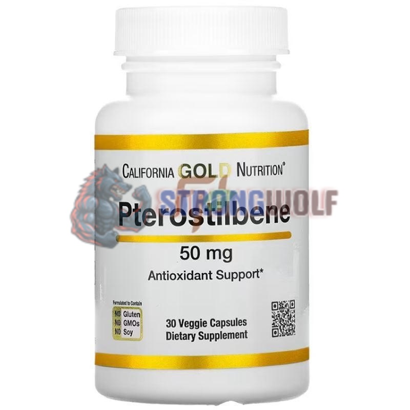 Пищевая добавка от американского бренда Калифорния Голд Нутришн содержит птеростильбен в веганских капсулах, в дозировке 50 мг. Количество порций в упаковке: 30